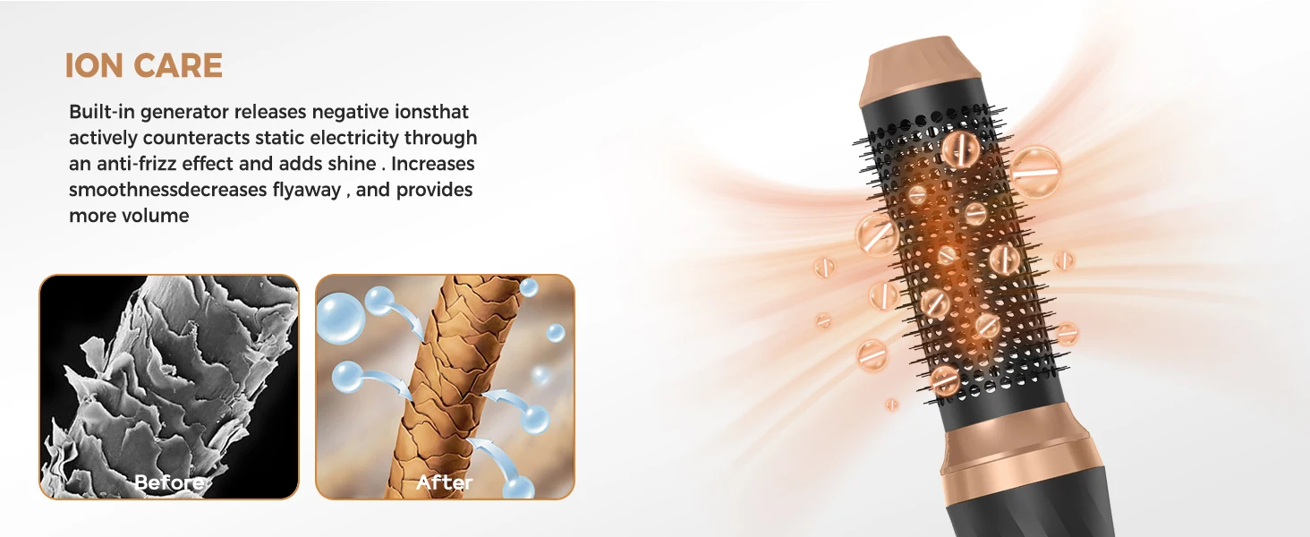 AUTO AIR CURLING LRON: Powerful brush blow dryer curling iron set airflow blows out from the air curler attachment, continuously forming a clockwise surrounding airflow around the curler, Enhanced Coanda effect, makes hair automatically adhere to the surface, for clockwise and counterclockwise curls. Creates voluminous, smooth, and natural curls without extreme heating, creating hassle-free curls in seconds. 5 in one Hot Air Brush set meet All Your Style Needs, be the most shining queen.