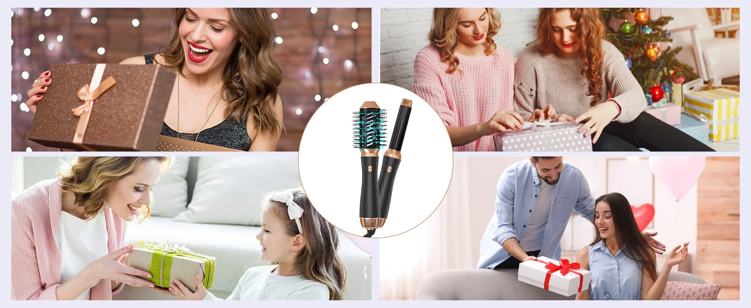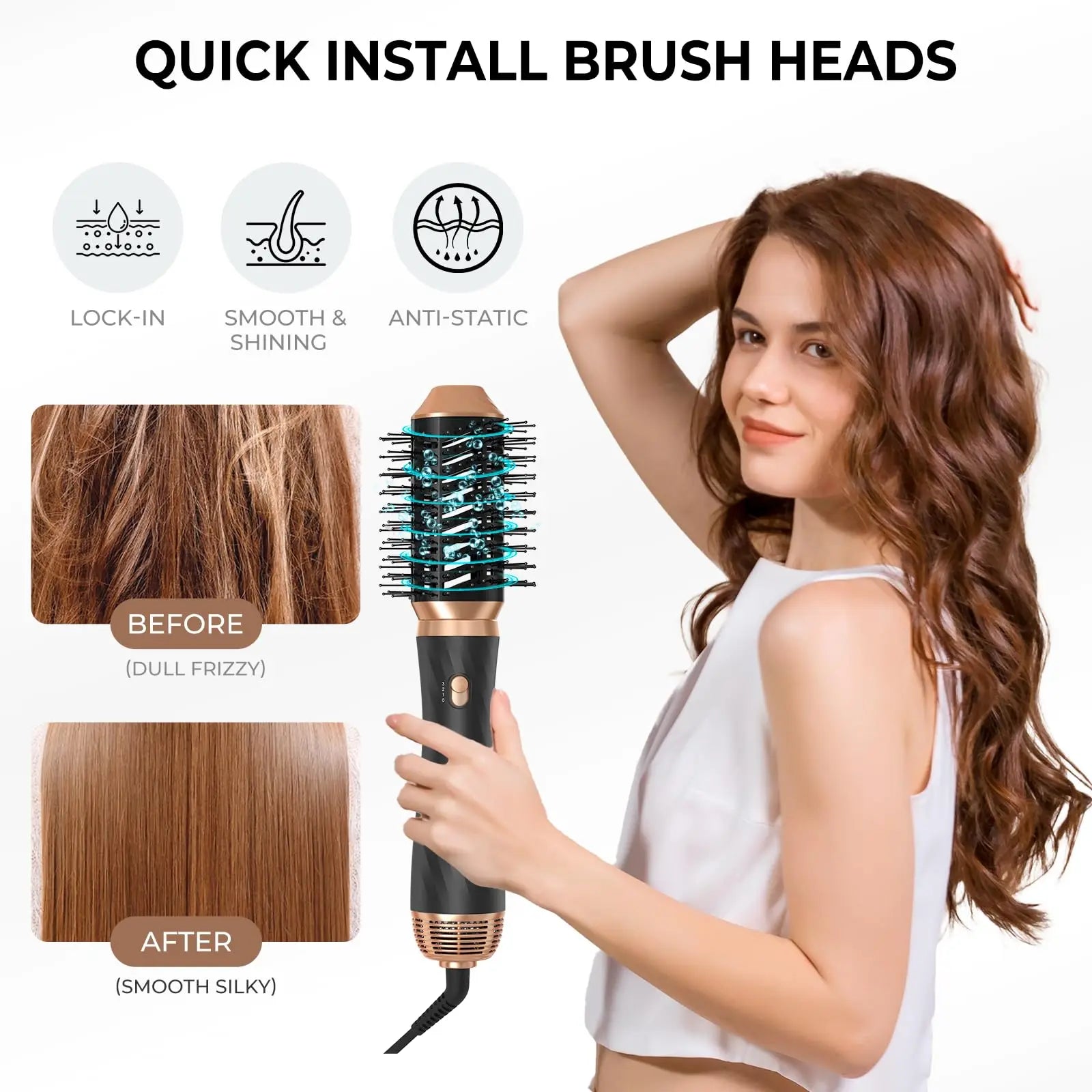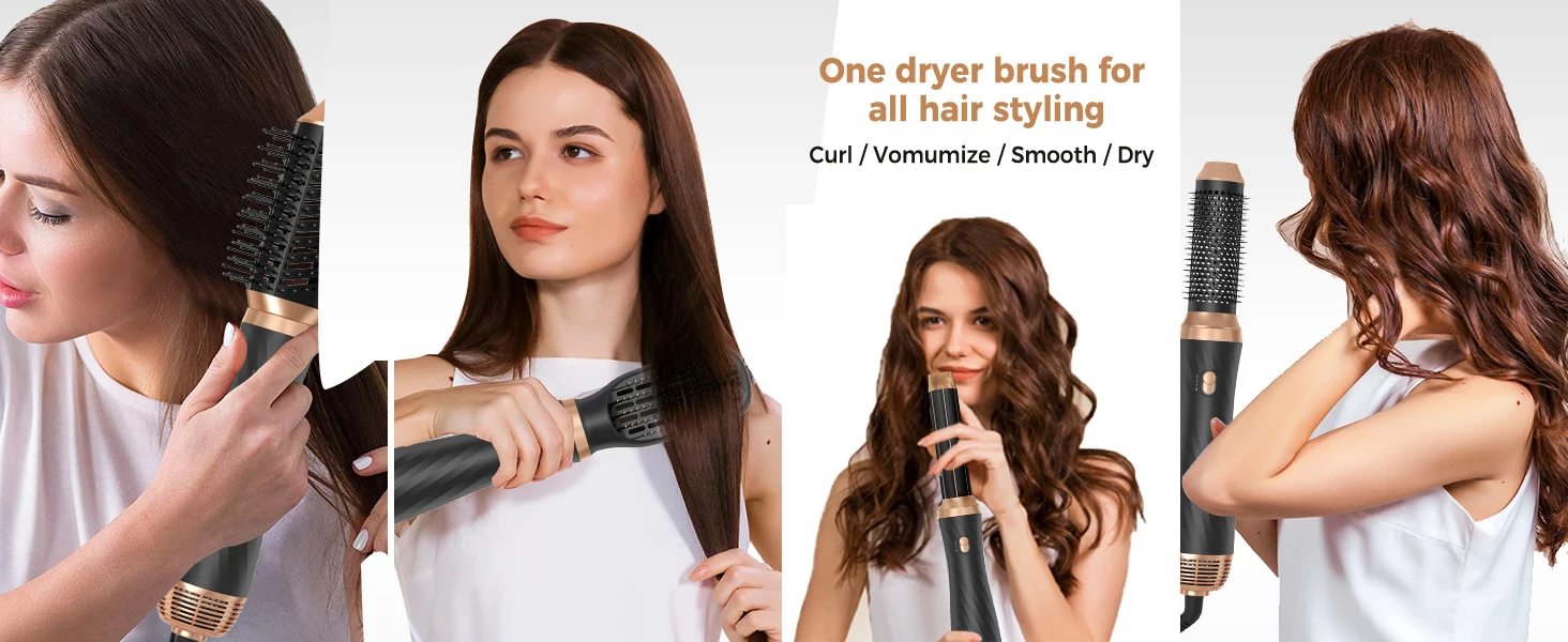 6 IN ONE BLOW DRYER BRUSH FOR WOMEN: Multifunctional blow dryer brush allow you easily become your own stylist and create various styles you want. Hair dryer brush set includes 1 * hair dryer, 1*hair straightening brush, 2 * left right hot air curler, 1* Styling Brush for straightening and volumizing, 1 * Massage hot air brush for daily combing , 1* heat-resistant glove. It is easy to change brush heads just by pressing the button.