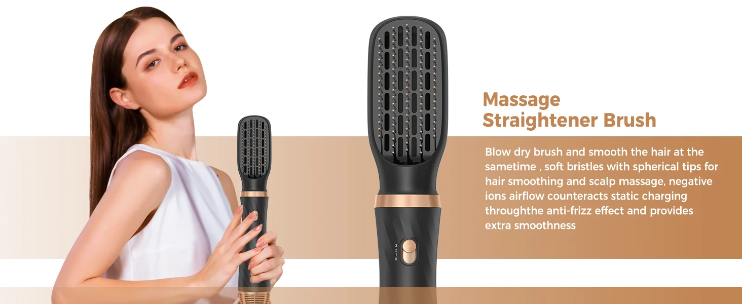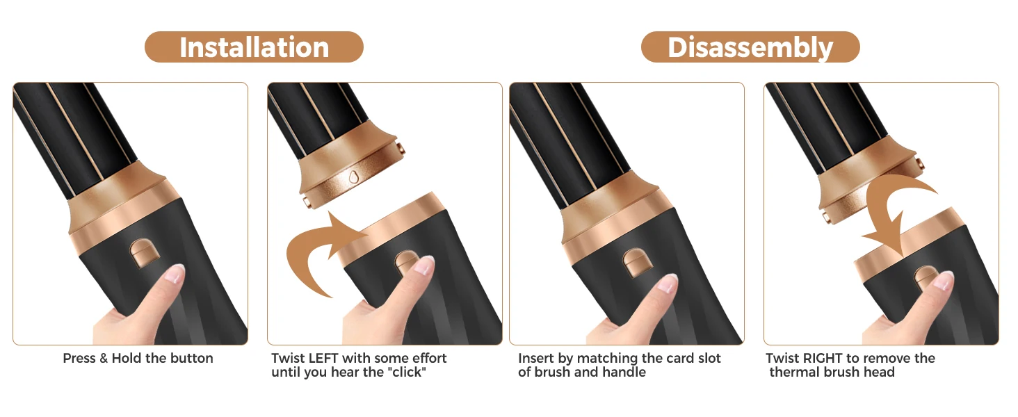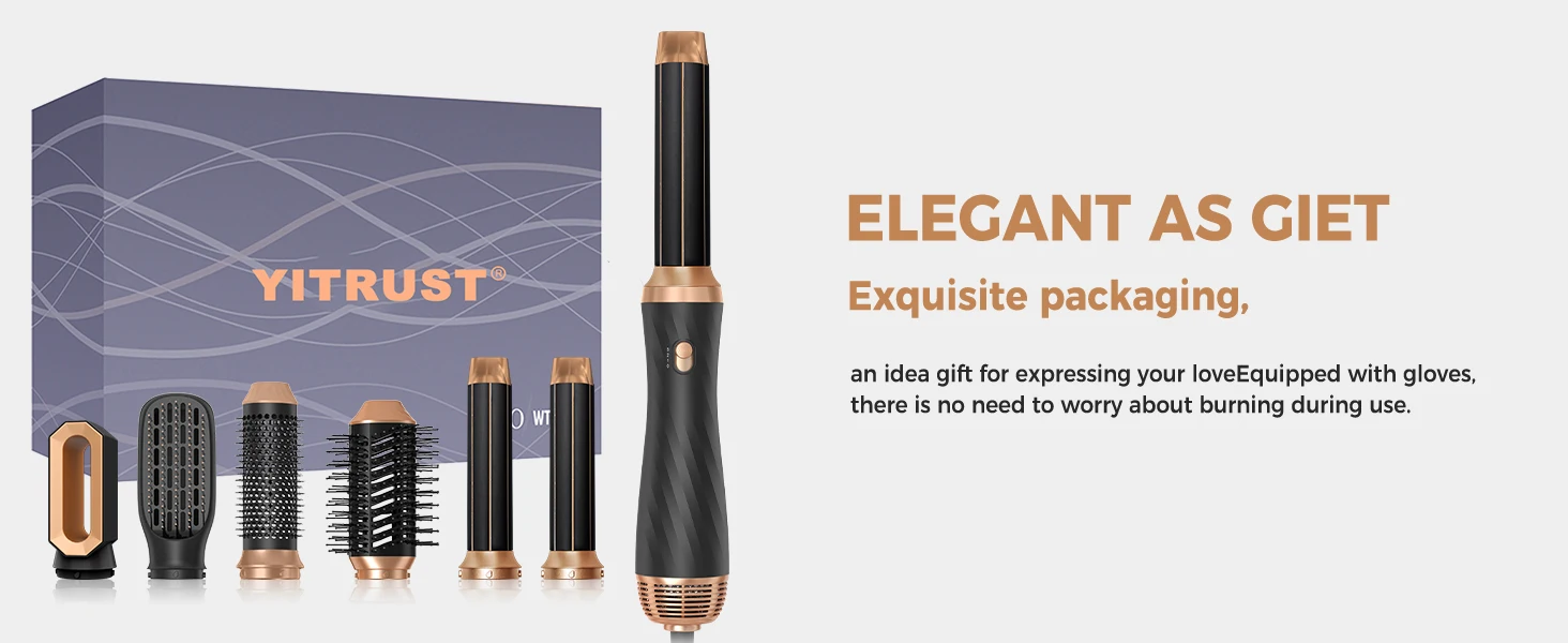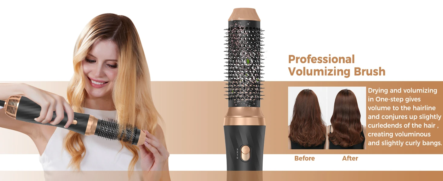 6 IN ONE BLOW DRYER BRUSH FOR WOMEN: Multifunctional blow dryer brush allow you easily become your own stylist and create various styles you want. Hair dryer brush set includes 1 * hair dryer, 1*hair straightening brush, 2 * left right hot air curler, 1* Styling Brush for straightening and volumizing, 1 * Massage hot air brush for daily combing , 1* heat-resistant glove. It is easy to change brush heads just by pressing the button.